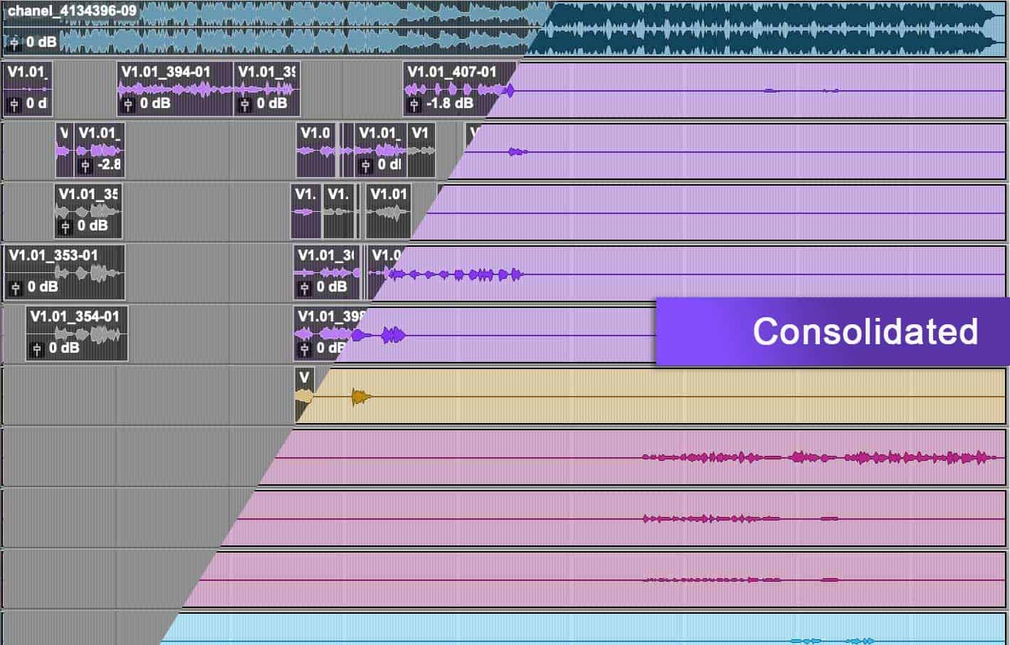 Producers, audio engineers, and rerecording mixers use many different audio software programs that they prefer. You often can not load sessions from one program to the other. In this case, it’s best to consolidate your multitrack audio regions.