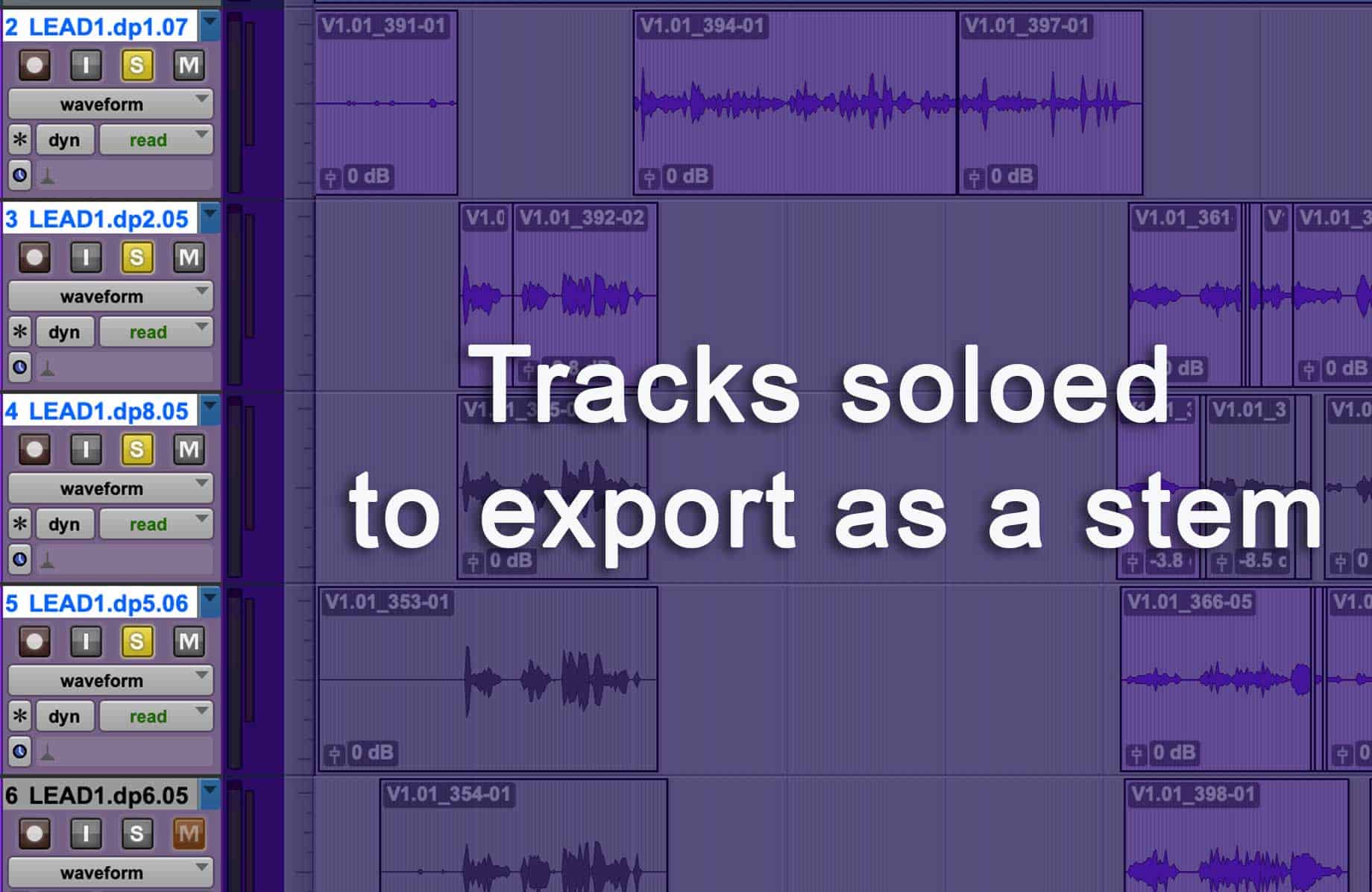 - You can solo selected tracks in a session to export such as instruments, vocals, ambiance, SFX, Foley, or dialogue. After the selected tracks have been soloed, select bounce to disk or export mix depending on the program. You will then repeat the process for each stem that needs to be exported.
